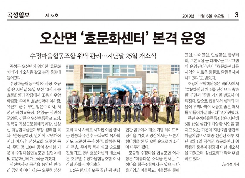 수정마을 '효문화센터' 본격 운영 페이지 정보 작성자 최고관리자 작성일19-11-07 14:16 조회1,842회 댓글0건 관련링크 이전글 다음글 목록 답변 글쓰기 본문 곡성일보 2019년 11월 6일자 기사에서 지난 10월 25일 효문화센터에서 열린 수정마을협동조합 설립예배 및 효문화센터 개소식 행사 관련 보도를 하였습니다. SNS공유 댓글목록 등록된 댓글이 없습니다. 이전글 다음글 목록 답변 글쓰기