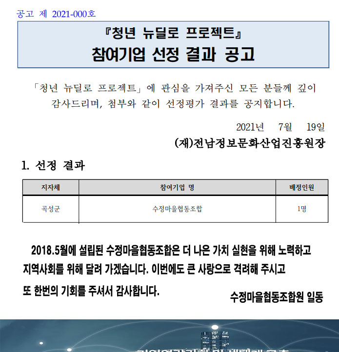 수정마을협동조합이 청년 뉴딜로 프로젝트 기업에 선정되었습니다.