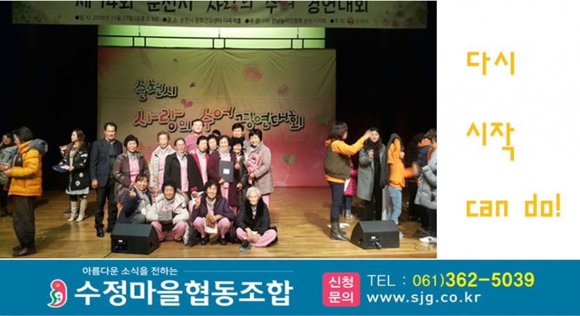 '수정수어랑' 평생동아리 선정 페이지 정보 작성자 최고관리자 작성일23-02-25 08:55 조회1,060회 댓글0건 관련링크 이전글 다음글 목록 답변 글쓰기 본문 '수정수어랑'이 곡성미래교육재단 평생학습동아리에 선정되었습니다. 시니어의 인지기능이 회복되기를 기대합니다. SNS공유 댓글목록 등록된 댓글이 없습니다. 이전글 다음글 목록 답변 글쓰기