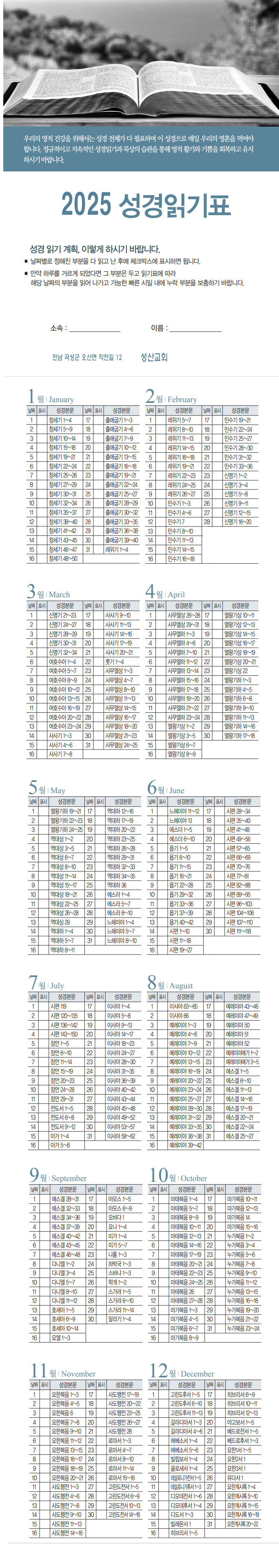 공지 | 2025 성경 읽기표 페이지 정보 작성자 최고관리자 작성일24-12-28 00:36 조회1,325회 댓글0건 관련링크 이전글 다음글 목록 글쓰기 본문 * SNS공유 댓글목록 등록된 댓글이 없습니다. 이전글 다음글 목록 글쓰기