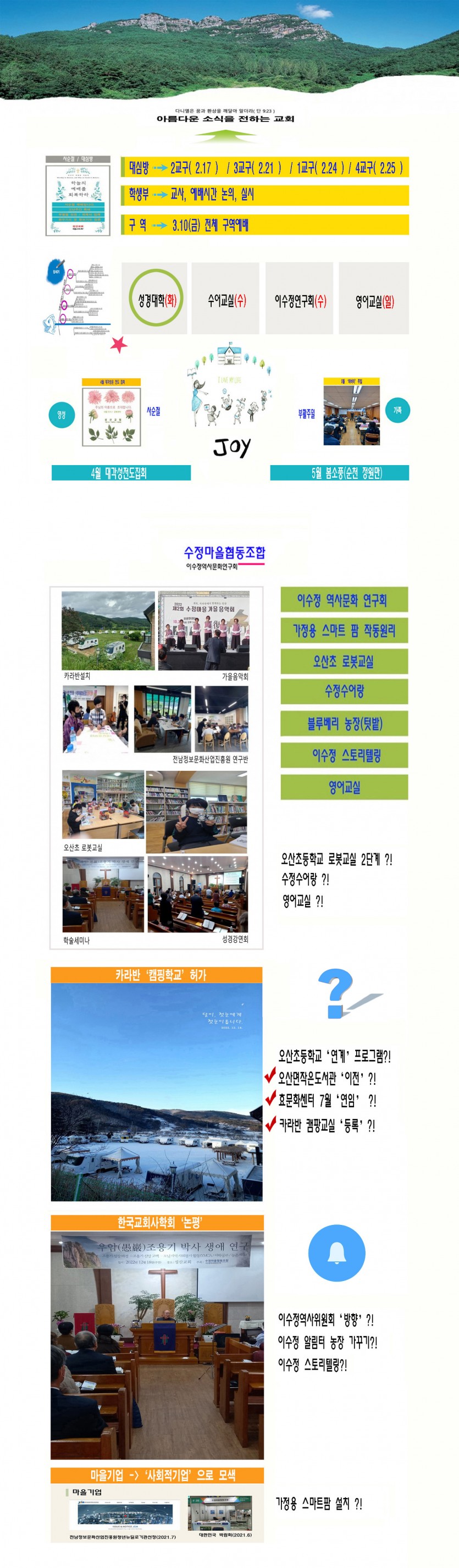 2.20 예배안내 페이지 정보 작성자 최고관리자 작성일23-02-18 20:51 조회1,053회 댓글0건 관련링크 이전글 다음글 목록 글쓰기 본문 2월 '대심방'이 시작되었습니다. 성심으로 섬겨주신 2교구 성도님께 감사한 마음을 전합니다. '잠시 쉼' 같은 세월 속에 예수님 마음 본 받아 온유와 겸손의 마음으로 하나님의 뜻을 깨닫는 일들이 많이 일어나기를 소망합니다. ** 내일 기쁜 마음으로 뵙겠습니다. 감사합니다. 오주현 목사 드림. SNS공유 댓글목록 등록된 댓글이 없습니다. 이전글 다음글 목록 글쓰기