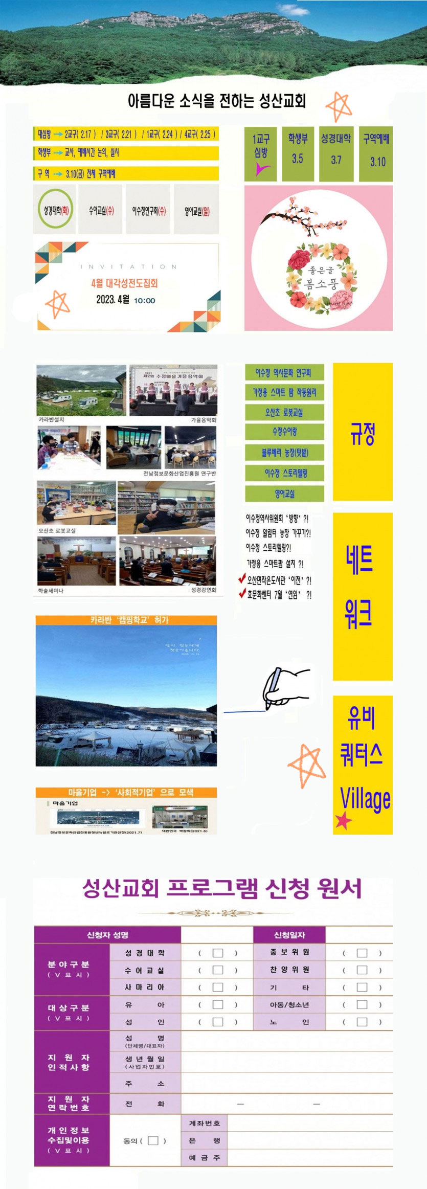 3.05 예배 페이지 정보 작성자 최고관리자 작성일23-03-04 20:14 조회1,013회 댓글0건 관련링크 이전글 다음글 목록 글쓰기 본문 '3월' 수정마을(애) 다시, 봄이 옵니다. 예배 '부활'을 넘어 5월 '소풍'까지 아름다운 '동행'이 되기를 소망합니다. 오주현 목사 드림. SNS공유 댓글목록 등록된 댓글이 없습니다. 이전글 다음글 목록 글쓰기