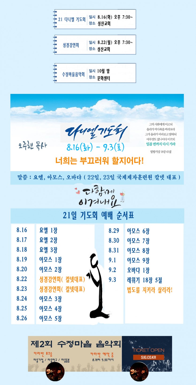 7.30 예배안내 페이지 정보 작성자 최고관리자 작성일22-07-30 17:33 조회1,337회 댓글0건 관련링크 이전글 다음글 목록 글쓰기 본문 이제 다시! 시작할 때입니다. 기도로 새로운 지평을 새판으로 다시 짜서, 코로나 이후 새롭게 만들어가 가시기를 기도합니다. SNS공유 댓글목록 등록된 댓글이 없습니다. 이전글 다음글 목록 글쓰기