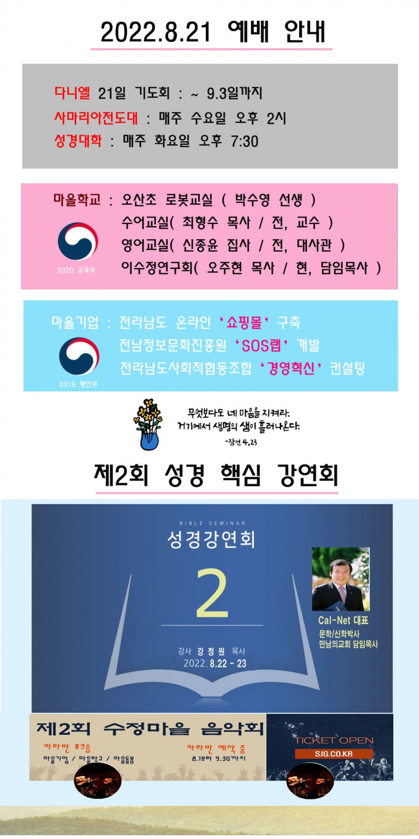 8.21일 예배 안내 페이지 정보 작성자 최고관리자 작성일22-08-20 17:59 조회1,270회 댓글0건 관련링크 이전글 다음글 목록 글쓰기 본문 오는 8.21일부터 8.23일까지 성경강연회가 오후 7시부터 성산교회에서 개최됩니다. 많이 참석하셔서 은혜의 시간이 되시기를 소망합니다. SNS공유 댓글목록 등록된 댓글이 없습니다. 이전글 다음글 목록 글쓰기