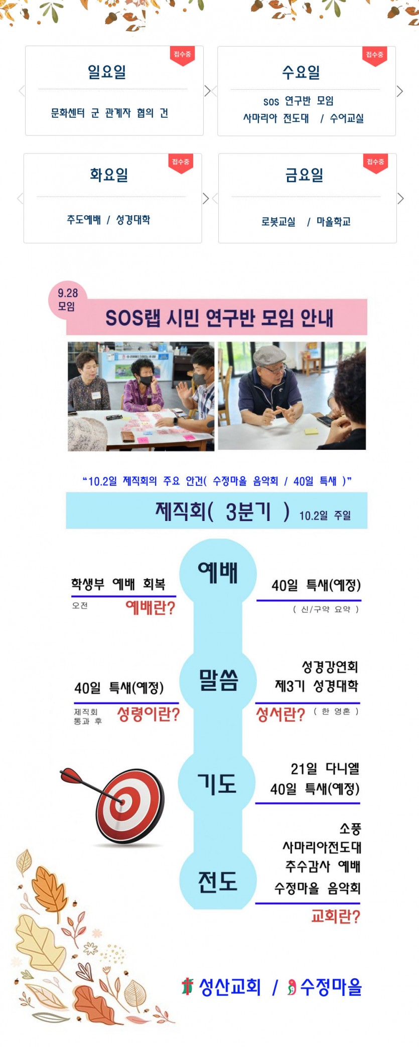 9.25일 예배안내 페이지 정보 작성자 최고관리자 작성일22-09-24 18:02 조회1,285회 댓글0건 관련링크 이전글 다음글 목록 글쓰기 본문 주님 이름으로 문안합니다. 다니엘 21 기도 후 시행 되는 모든 일들이 아름답게 결실 맺기를 기도합니다. 특히, 제직회 결의 따라 수정음악회. 40특새. 추수감사. 정책회의. 송구영신. 은혜롭게 열매 맺기를 소망합니다. 감사합니다. 오주현 목사 드림. SNS공유 댓글목록 등록된 댓글이 없습니다. 이전글 다음글 목록 글쓰기