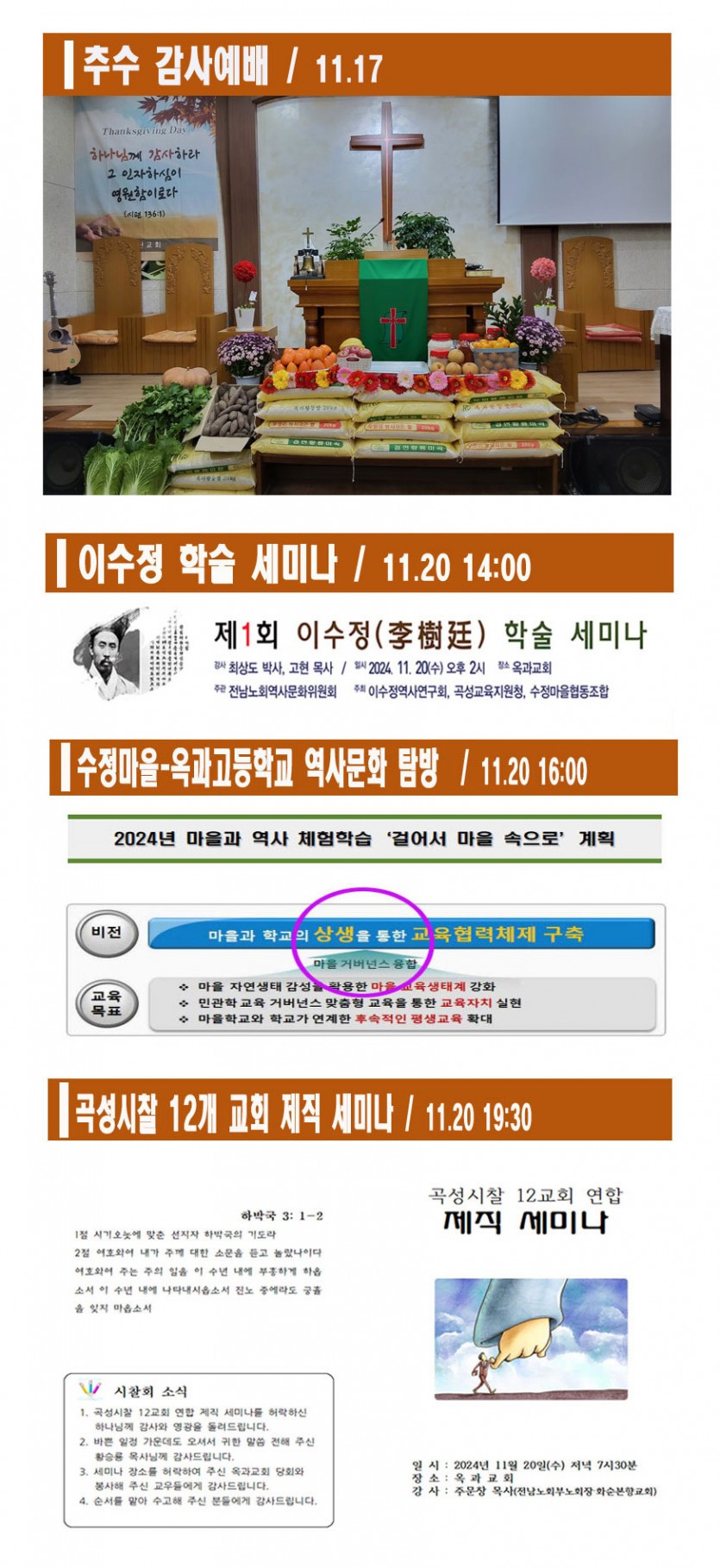공지 | 11.17 예배 페이지 정보 작성자 최고관리자 작성일24-11-16 21:45 조회1,231회 댓글0건 관련링크 이전글 다음글 목록 글쓰기 본문 내일 예배는 추수 감사예배입니다. '정결한 마음'으로 나아오시기를 기도합니다. 그리고 11.20일(수)일은 *이수정 학술세미나 *수정마을-옥과고 역사문화 탐방 *제직세미나가 개최됩니다. 성도님의 관심과 사랑으로 원활히 진행될 수 있도록 섬겨주시면 감사하겠습니다. 오주현 목사 드림, SNS공유 댓글목록 등록된 댓글이 없습니다. 이전글 다음글 목록 글쓰기