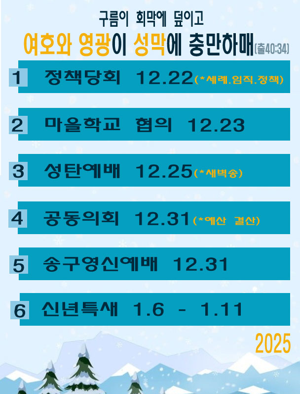 공지 | 정책당회 2025 페이지 정보 작성자 최고관리자 작성일24-12-16 19:15 조회1,305회 댓글0건 관련링크 이전글 다음글 목록 글쓰기 본문 *40일 특별새벽 기도회 수고 많으셨습니다. *하나님의 은혜가 임하시기를 기대합니다. 2025. SNS공유 댓글목록 등록된 댓글이 없습니다. 이전글 다음글 목록 글쓰기