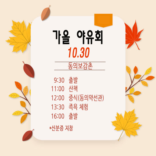 공지 | 10.30 가을 야유회 페이지 정보 작성자 최고관리자 작성일25-10-28 10:19 조회656회 댓글0건 관련링크 이전글 다음글 목록 글쓰기 본문 SNS공유 댓글목록 등록된 댓글이 없습니다. 이전글 다음글 목록 글쓰기