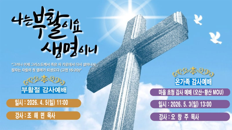 공지 | 부활절 감사예배 페이지 정보 작성자 최고관리자 작성일26-04-04 17:41 조회6회 댓글0건 관련링크 이전글 다음글 목록 글쓰기 본문 * SNS공유 댓글목록 등록된 댓글이 없습니다. 이전글 다음글 목록 글쓰기